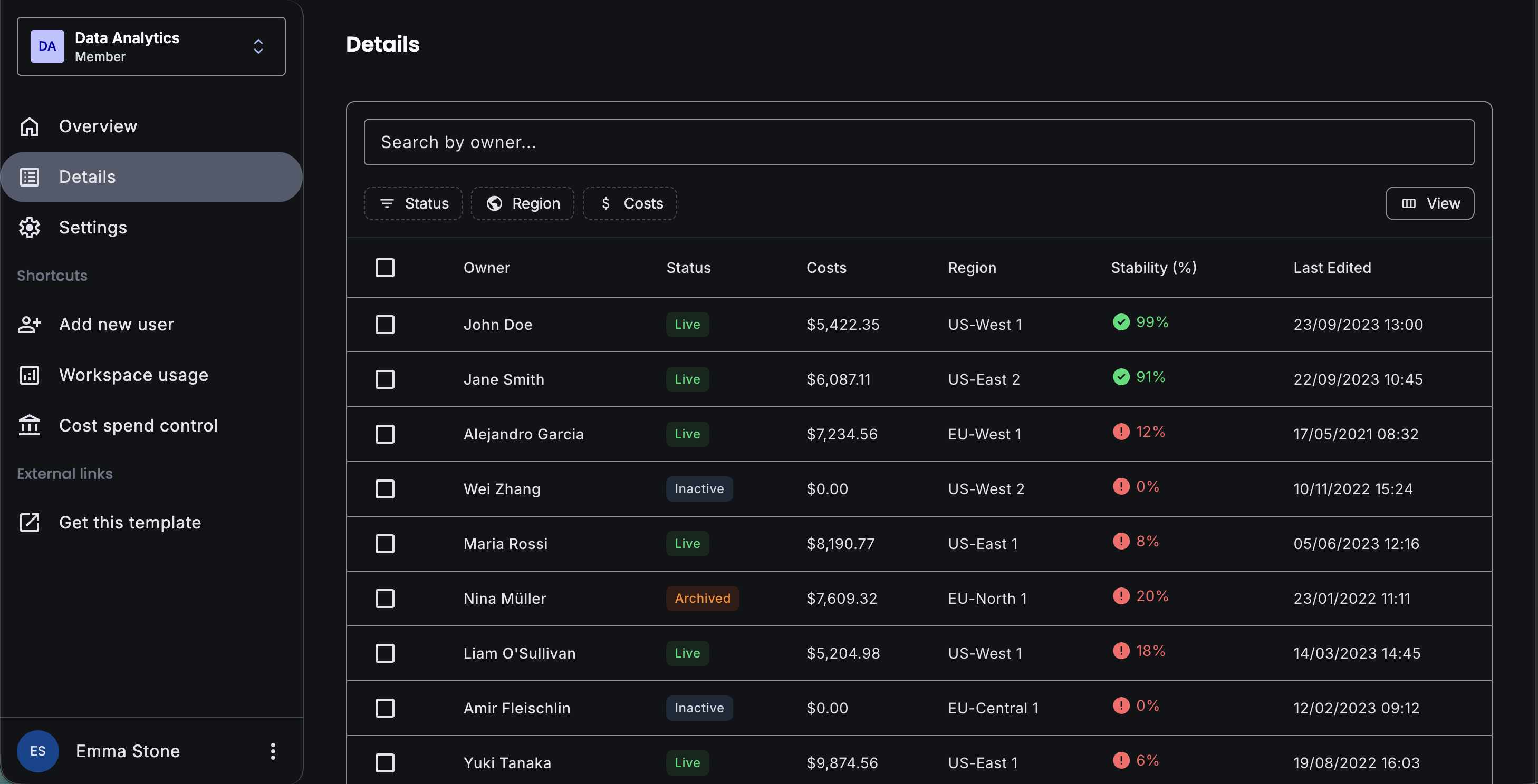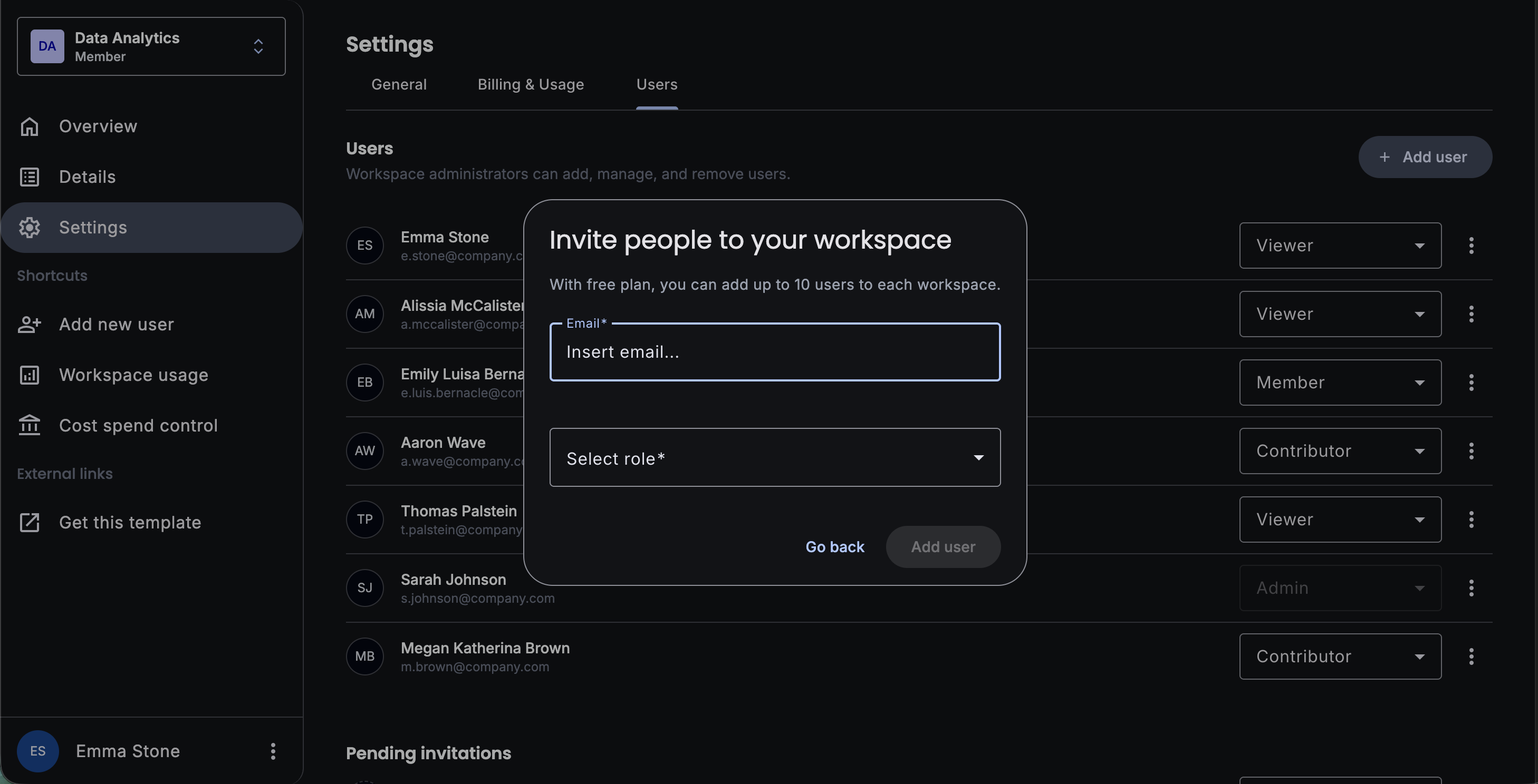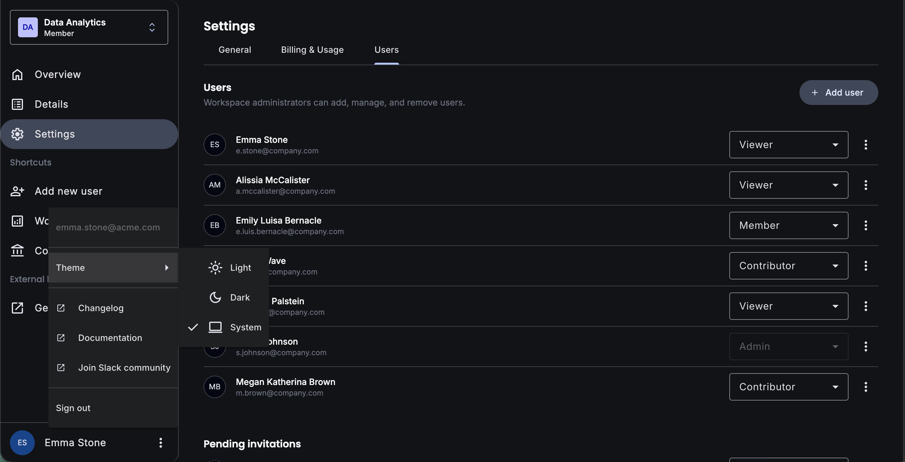 User administration interface with team member lists, pending invitations, and role management. Includes action menus and status indicators.