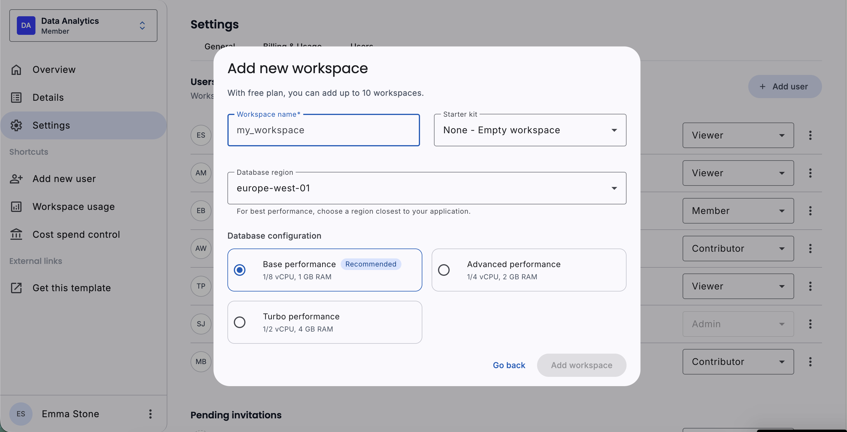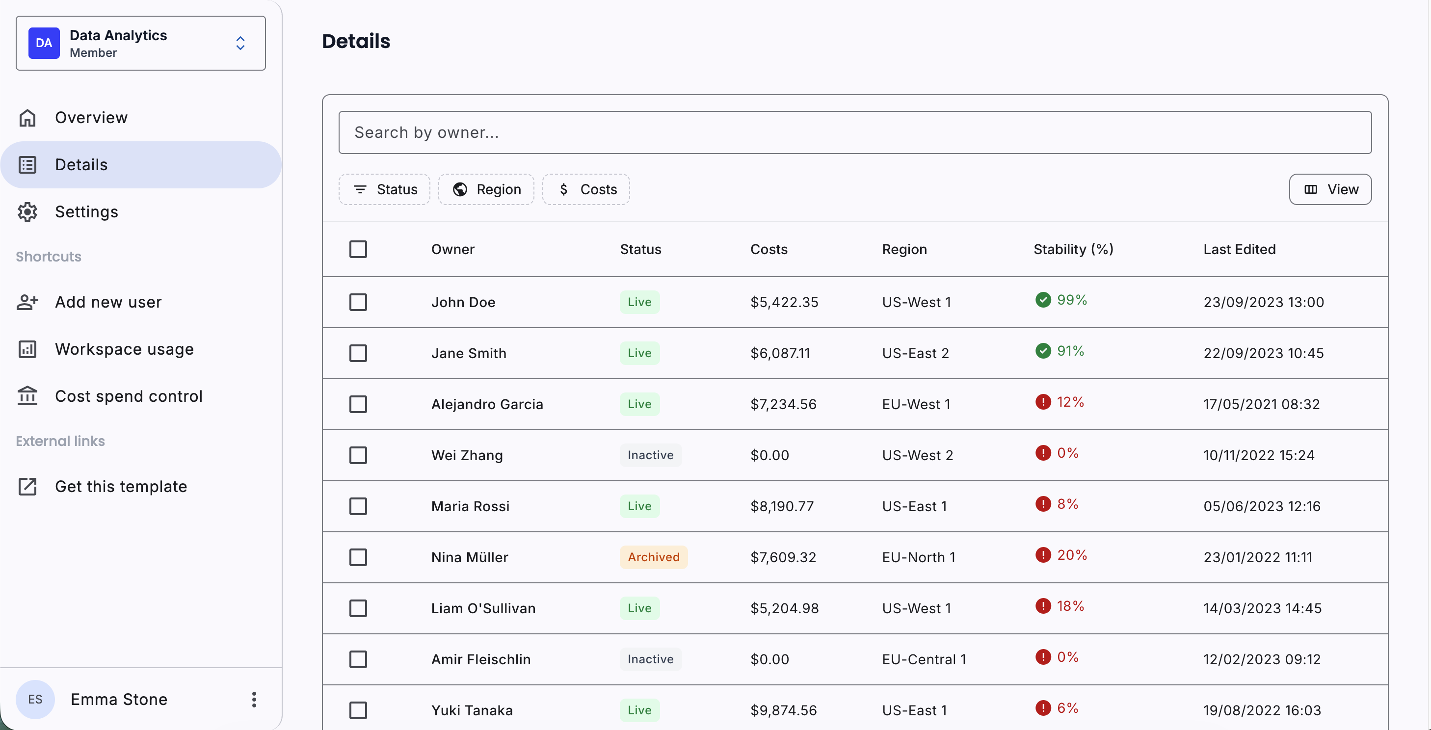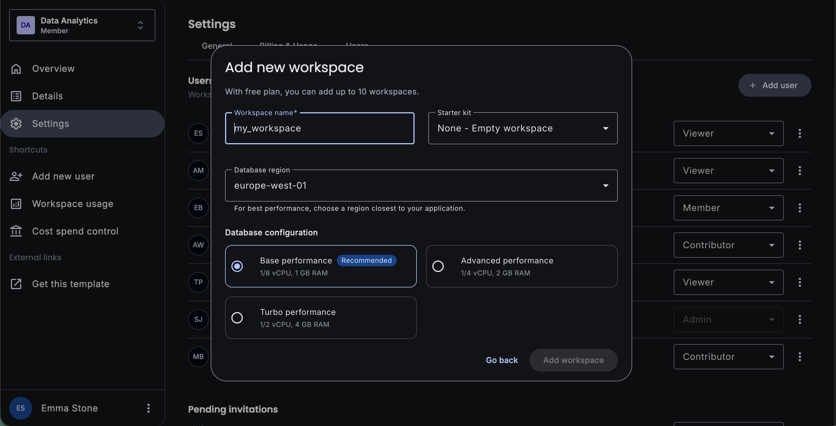 User administration interface with team member lists, pending invitations, and role management. Includes action menus and status indicators.