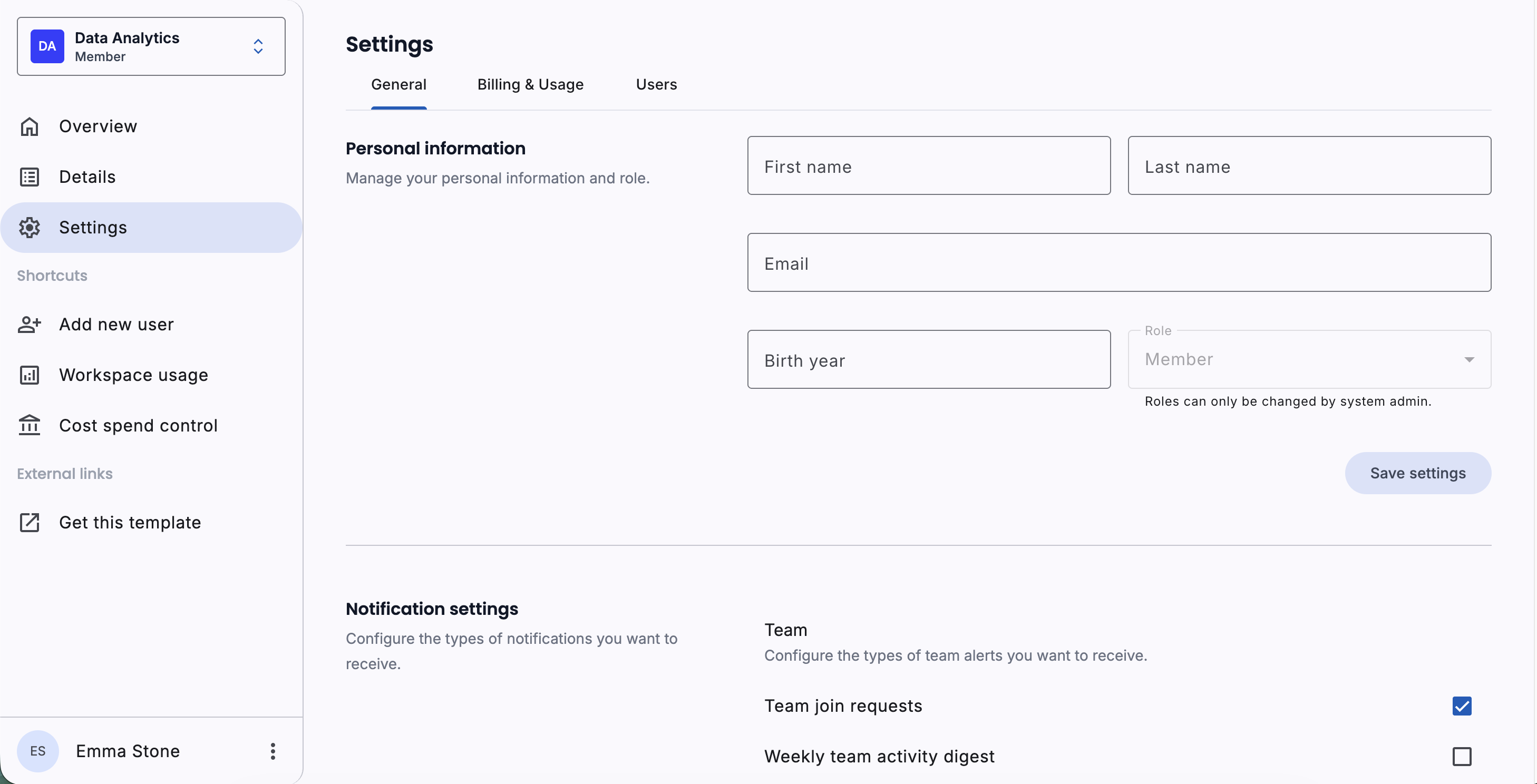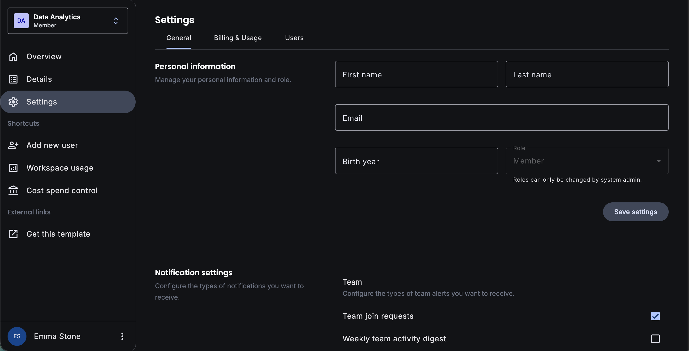 User settings page with form controls for profile management, preferences, and account configuration. Demonstrates form validation and Material input components.