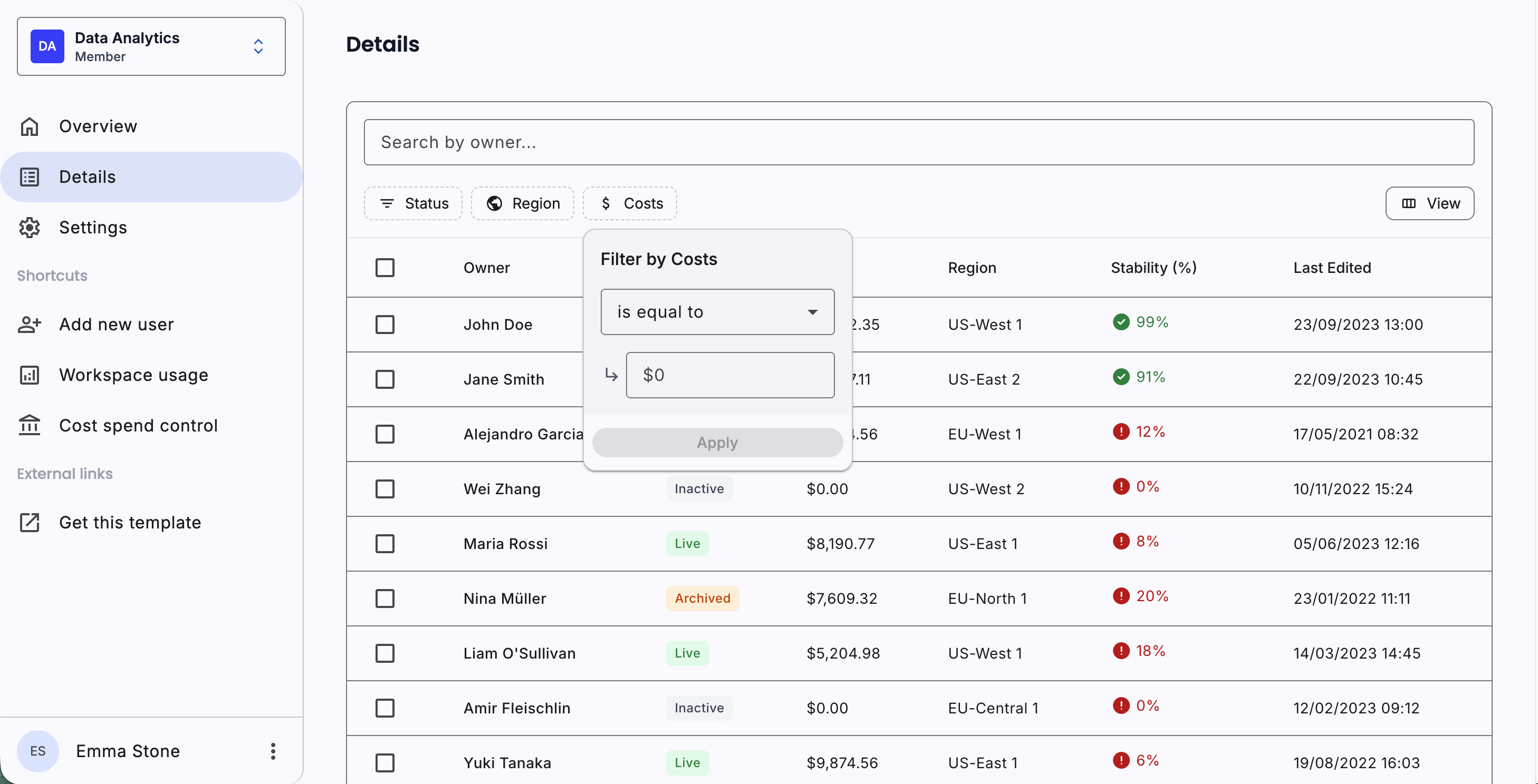 Advanced data table with sorting, filtering, and pagination. Includes search functionality, column customization, and responsive design for mobile devices.